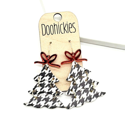• Houndstooth Christmas Tree Earrings w/ Red Mirror Bow - Cork